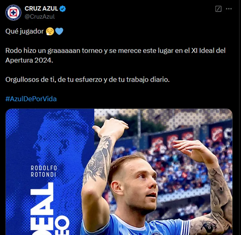 Ante esto, el propio cementero y en este caso desde su cuenta de X (ex Twitter) salió a respaldarlo. “Qué jugador. Rodo hizo un graaaaaan torneo y se merece este lugar en el XI Ideal del Apertura 2024. Orgullosos de ti, de tu esfuerzo y de tu trabajo diario”, indica dicho mensaje que, una vez más, fue altamente comentado.