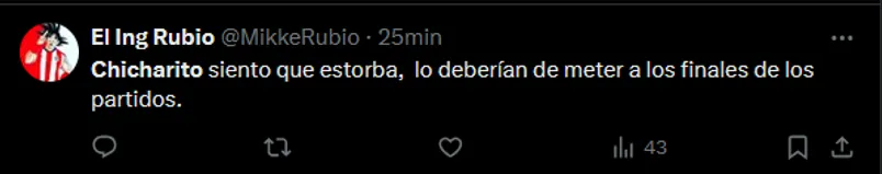 “Kevin Mier está loquísimo, lo amo.”, “Ese amague de Mier al anciano de chicharo”, “Jajajajajaja Mier retiró a Chicharito con ése quiebre de cadera.”. “Kevin Mier acaba de jubilar al Chichabuelo”, “Mier acaba de terminar de retirar al Chicharito jajajaa, Chivas juega horrible”, fueron algunos de los comentarios.