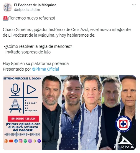 “¡Tenemos nuevo refuerzo! Chaco Giménez, jugador histórico de Cruz Azul, es el nuevo integrante de El Pódcast de la Máquina”, publicó el programa en sus redes. Así, será este mismo miércoles cuando el Chaco tenga su debut en la emisión, en punto de las 20:00 horas, tiempo del centro de México.