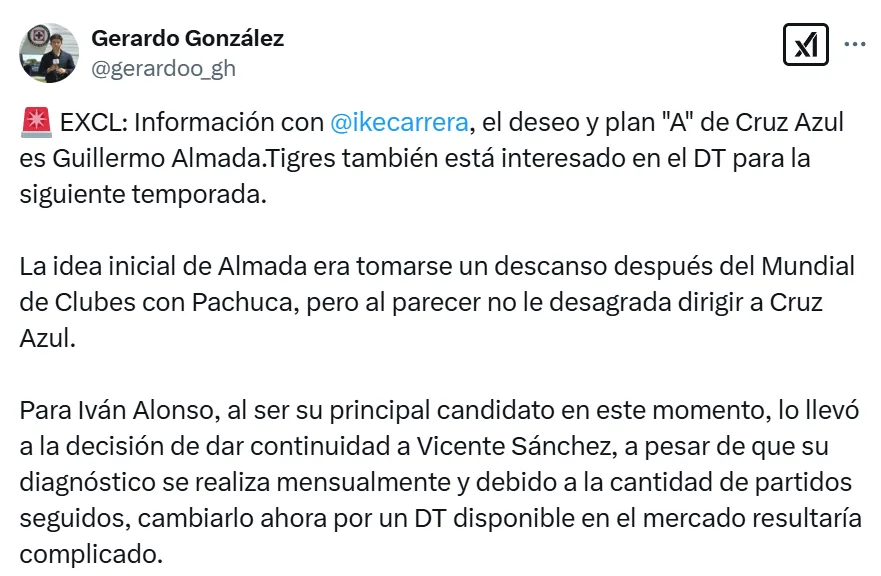 De acuerdo con información de Gerardo González, periodista de Récord, los Tigres también buscarían a Guillermo Almada en verano. “El deseo y plan “A” de Cruz Azul es Guillermo Almada. Tigres también está interesado en el DT para la siguiente temporada”