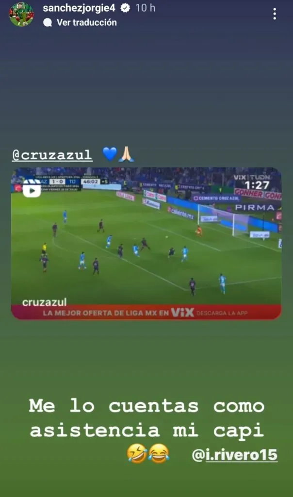 A través de sus stories de Instagram, Jorge Sánchez replicó un video del gol de Nacho Rivero, en donde se observa el remate previo del defensa que pega en el poste para luego quedarle al uruguayo. “Me lo cuentas como asistencia, mi capi”, bromeó el refuerzo, etiquetando al capitán de Cruz Azul.