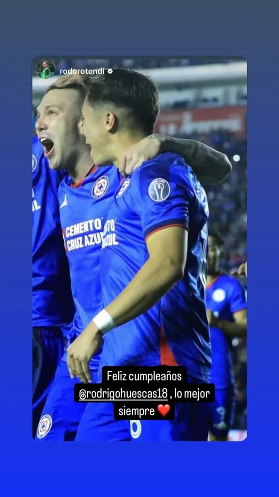 Se trata de Rodolfo Rotondi, quien envió sus mejores deseos a Rodrigo Huescas a través de una historia en su cuenta de Instagram, acompañados de una postal en la que aparecen juntos festejando un gol de Cruz Azul. “Feliz cumpleaños, lo mejor siempre”, escribió el argentino.