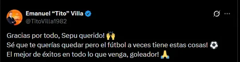 A través de su cuenta personal de X, Tito le dejó un emotivo recado al flamante recuerdo de Guadalajara y otras personas también reaccionaron. “Gracias por todo, Sepu querido! Sé que te querías quedar pero el fútbol a veces tiene estas cosas! El mejor de éxitos en todo lo que venga, goleador!“, esbozó Tito.