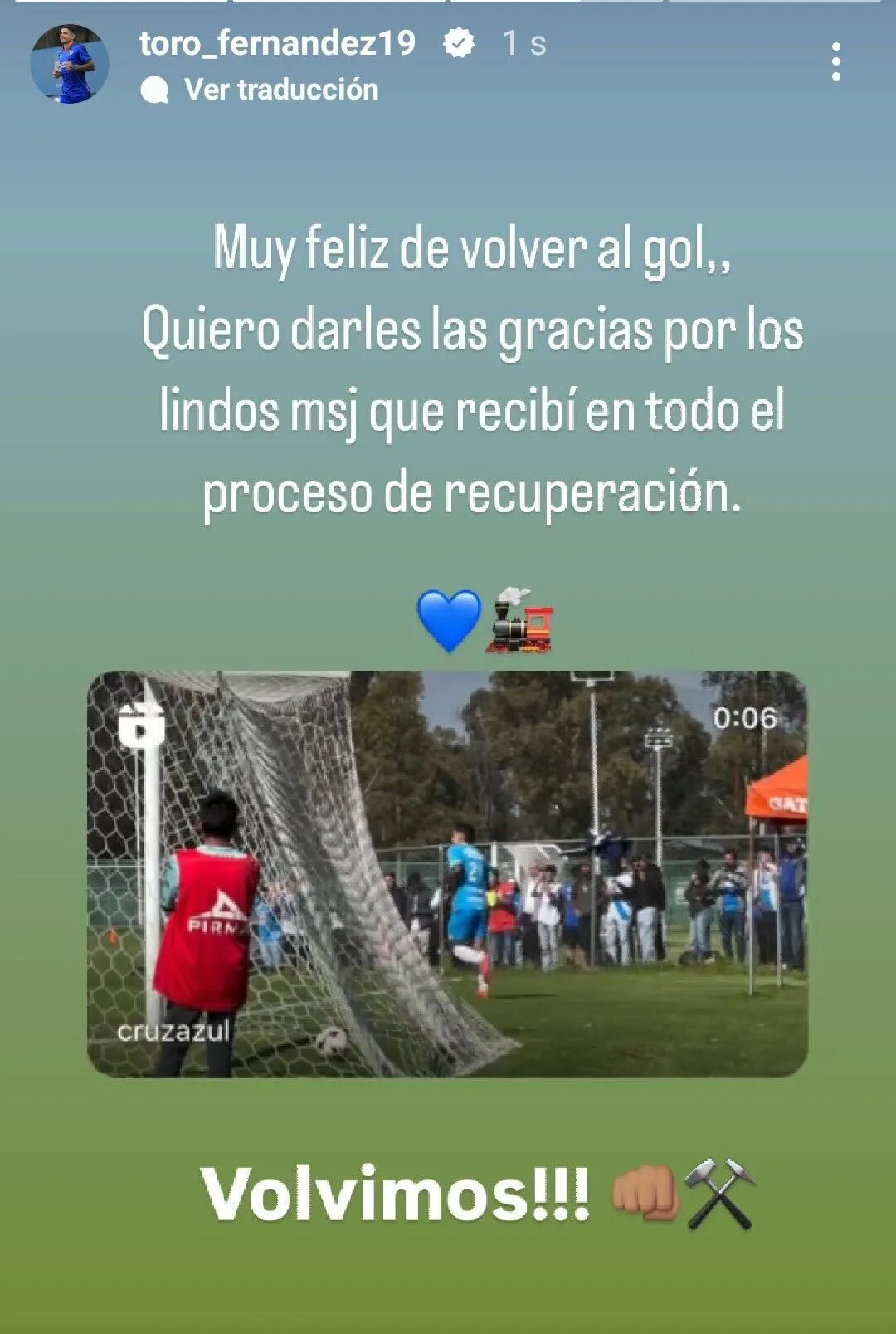 Luego de que Cruz Azul consumó su victoria por 3 a 1 ante La Franja, el Toro dejó una motivacional nota en sus redes sociales: “Muy feliz por volver al gol. Quiero darles las gracias por los lindos mensajes que recibí en todo el proceso de recuperación. Volvimos!!!”. Sin dudas su vuelta es considerada como un gran refuerzo de cara al inicio de la liguilla.