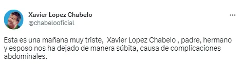 Fue a través de la cuenta oficial de Twitter de Chabelo el medio por el que su familia confirmó su triste fallecimiento a los 88 años de edad, la mañana de este sábado 25 de marzo, debido a complicaciones abdominales.