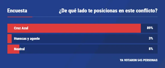 “¿De qué lado te posicionas en este conflicto?”, fue la pregunta realizada por este sitio en una reciente encuesta. El 89 por ciento de los votantes respondieron “Cruz Azul“. Por su parte, un 8 por ciento dijo mantenerse neutral en este conflicto, y solo un 3 por ciento se paró del lado de Rodrigo Huescas y su agente.