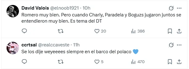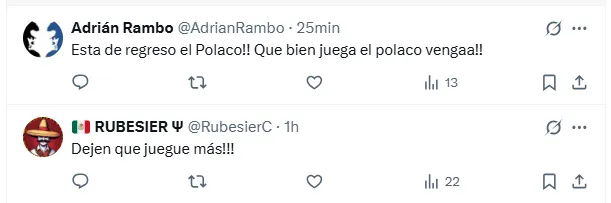 Mientras, otros expresaban su respaldo incondicional: “Se los dije weyeeees siempre en el barco del polaco” y “Yo siempre confié en él”. Además, celebraron su regreso al equipo titular, deseando verlo con mayor continuidad. “Esta de regreso el Polaco!! Que bien juega el polaco vengaa!!” y “Dejen que juegue más!!!” se leía.