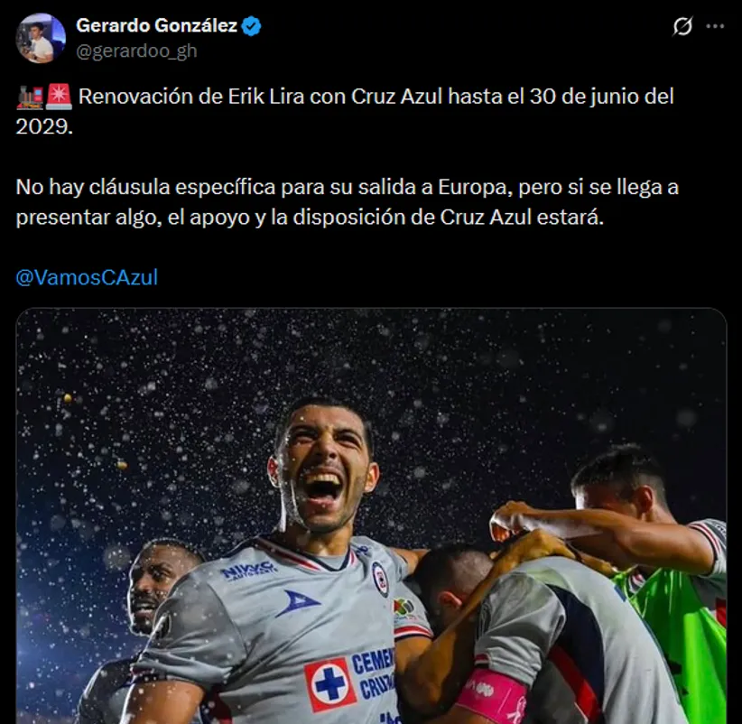 “Renovación de Erik Lira con Cruz Azul hasta el 30 de junio del 2029. No hay cláusula específica para su salida a Europa, pero si se llega a presentar algo, el apoyo y la disposición de Cruz Azul estará”, indicó el reportero sorprendiendo con parte de su información, sobre todo por el tema cláusula.