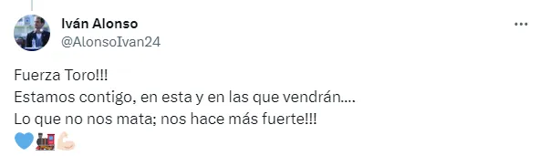 “Fuerza Toro!!! Estamos contigo, en esta y en las que vendrán…. Lo que no nos mata; nos hace más fuerte!!!”, escribió el flamante directivo de Cruz Azul, a través de su cuenta de Twitter, sumándose así a jugadores como Carlos Salcedo, Ángel Sepúlveda, Gonzalo Piovi, Carlos Rodríguez y Uriel Antuna, quienes también alentaron al Toro.