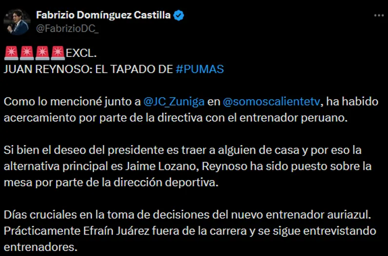 “Juan Máximo Reynoso es buscado por Pumas para ser su nuevo DT. Ya hubo acercamiento con el peruano. Estratega con experiencia y ya fue campeón con Cruz Azul dándoles la novena. Con Jaime Lozano aún restan detalles y no hay nada definido aún”, explicó en reportero de TVC Deportes.