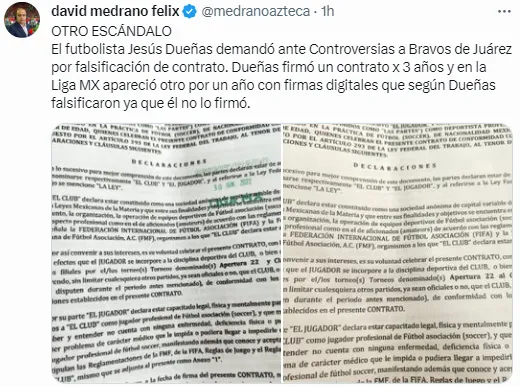 El periodista de TV Azteca y Récord compartió dos imágenes afirmando que Jesús Dueñas firmó un contrato por tres años con los Bravos, pero que en la Liga MX apareció otro por un año con firmas digitales que el futbolista señala no haber realizado.