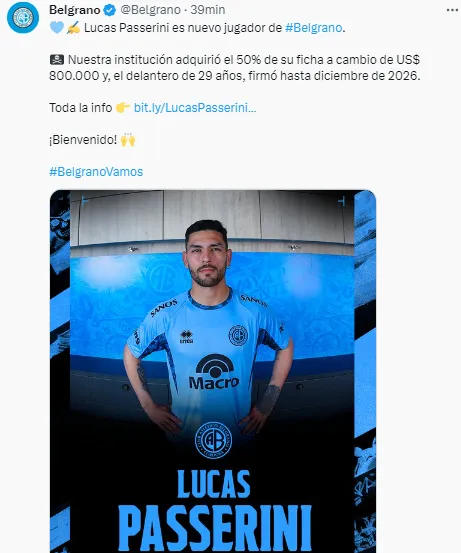 Se trata de Belgrano de Córdoba, un popular equipo del interior de aquel país. “Lucas Passerini es nuevo jugador de #Belgrano. Nuestra institución adquirió el 50% de su ficha a cambio de US$ 800.000 y, el delantero de 29 años, firmó hasta diciembre de 2026″, anunciaron desde las cuentas oficiales del Pirata.