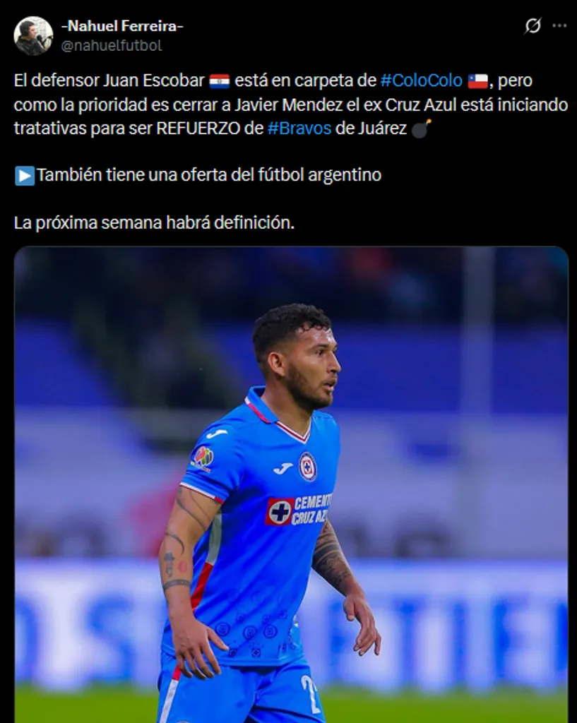 El periodista especializado Nahuel Ferreira informó a través de sus redes sociales que, aunque Juárez es una opción real, Escobar también figura en la carpeta de Colo-Colo. No obstante, el interés del club chileno está condicionado, ya que su prioridad actual es cerrar primero el fichaje de Javier Méndez antes de avanzar formalmente por el exjugador celeste.