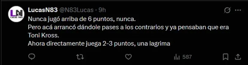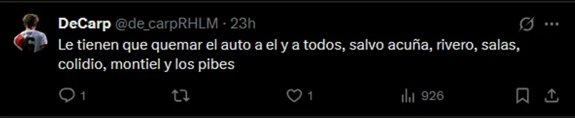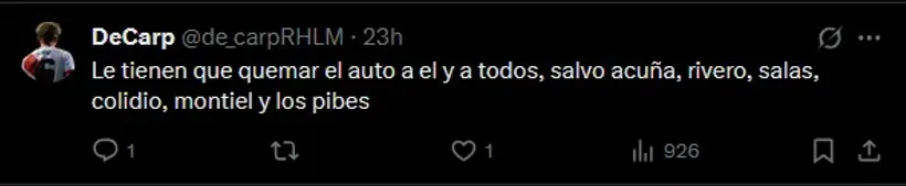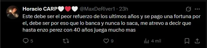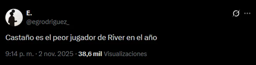 Los comentarios fueron variados pero firmes: quieren que salga ya. “14 palos costo el cagón y sin sangre de Castaño”, Este debe ser el peor refuerzo de los ultimos años y se pago una fortuna” o “Castaño es el peor jugador de River en el año” fueron algunos de los tuits dedicados para el ex jugador celeste.