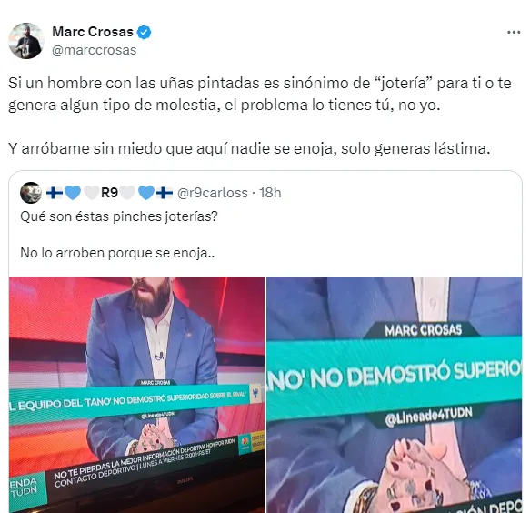 “Si un hombre con las uñas pintadas es sinónimo de “jotería” para ti o te genera algun tipo de molestia, el problema lo tienes tú, no yo. Y arróbame sin miedo que aquí nadie se enoja, solo generas lástima”, respondió muy molesto el ahora anlista de TUDN.