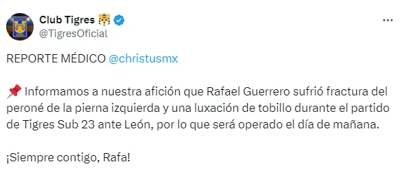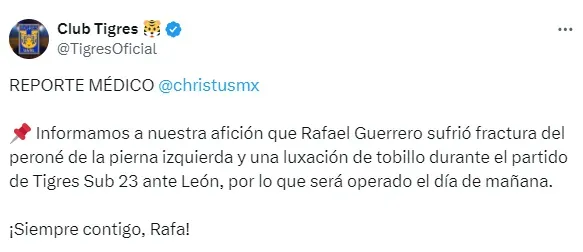 “Informamos a nuestra afición que Rafael Guerrero sufrió fractura del peroné de la pierna izquierda y una luxación de tobillo durante el partido de Tigres Sub 23 ante León, por lo que será operado el día de mañana. ¡Siempre contigo, Rafa!”
