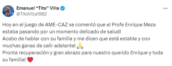 “Hoy en el juego de AME-CAZ se comentó que el Profe Enrique Meza estaba pasando por un momento delicado de salud. Acabo de hablar con su familia y me dicen que está estable y con muchas ganas de salir adelante. Pronta recuperación y gran abrazo para nuestro querido Enrique y toda su familia”, informó Tito Villa.