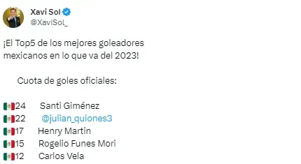Santi Giménez ha firmado un total de 24 goles en el año, seguido por Julián Quiñones, con 22. Después se encuentra Henry Martín con 17, Rogelio Funes Mori con 15 y finalmente Carlos Vela con 12, que ya no vestiría más la camiseta tricolor.