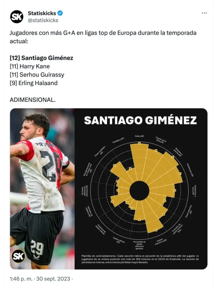 Y es que de acuerdo con la plataforma Statiskicks, Santiago Giménez es el jugador con más goles y asistencia en ligas top de Europa durante la temporada actual, con 12 (10 goles y dos asistencias).