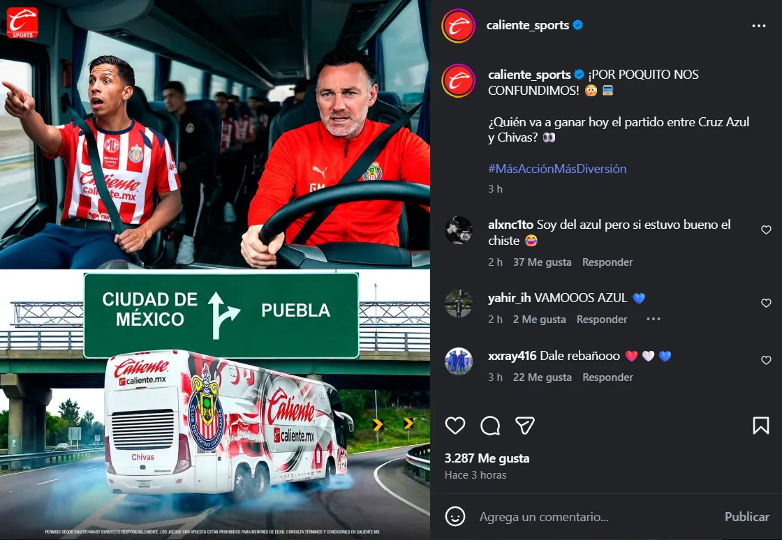 La casa de apuestas Caliente, que durante cinco años fue patrocinador oficial del cementero, lanzó un mensaje que muchos interpretaron como una burla directa. En la imagen se observa a Gabriel Milito conduciendo el autobús del Guadalajara y desviándose repentinamente hacia Puebla en lugar de la capital.