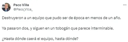 “Cruz Azul, uno de quince puntos. Ni se quejen de las críticas que reciben, mediocres. Exhiben su terrible planeación, su autodestrucción, su compleja manera de organizarse, misma que nadie entiende. Tienen lo que merecen”, lanzó Paco Villa, a través de su cuenta de Twitter.