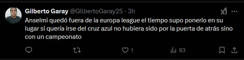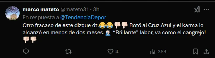 Ya lejos del cariño que todos le tenían, los fanáticos de Cruz Azul se mofaron de esta situación a través de las redes sociales, en donde lo hicieron tendencia rápidamente. Sobre todo esto ocurrió ex X (ex Twitter), con muchos mensajes burlones en contra del estratega argentino.