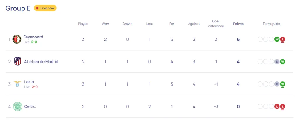 Con el triunfo momentáneo, el Feyenoord se mantiene por ahora como el líder del Grupo E con seis unidades, pues estaría registrando dos triunfos y una derrota. No obstante, el Atlético de Madrid todavía podría desbancarlo de la cima, pues todavía tiene pendiente su partido ante el Celtic y, de ganar, volvería a lo más alto de la Tabla de Posiciones, de lo contrario, el equipo de Santi Giménez dormiría como líder en solitario.