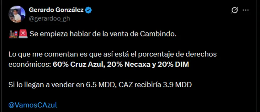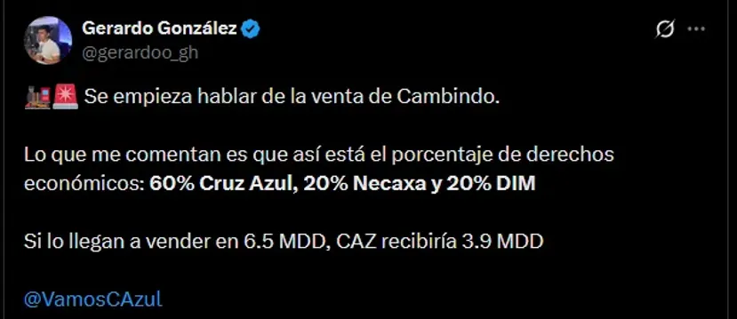 “Se empieza hablar de la venta de Cambindo. Lo que me comentan es que así está el porcentaje de derechos económicos: 60% Cruz Azul, 20% Necaxa y 20% DIM (Independiente Medellín). Si lo llegan a vender en 6.5 MDD, CAZ recibiría 3.9 millones de dólares”, amplió el reportero a través de su cuenta de X (ex Twitter).