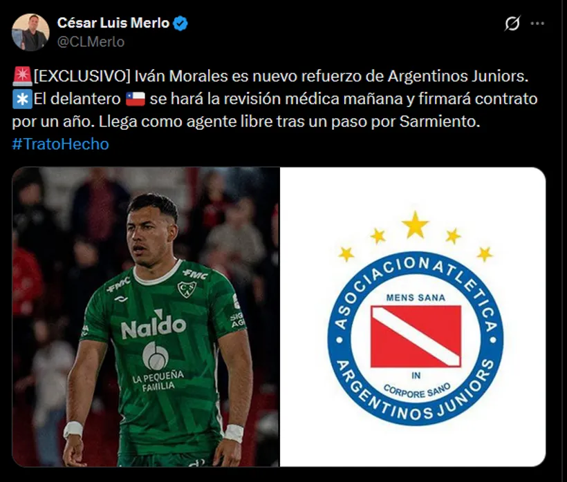 En las últimas horas, Iván Morales ha definido su futuro tras un periodo de incertidumbre en su carrera. Según informó el periodista César Luis Merlo en sus redes sociales, el chileno es el nuevo refuerzo de Argentinos Juniors. El jugador llega a la institución de La Paternal en condición de agente libre para intentar recuperar su mejor versión futbolística.