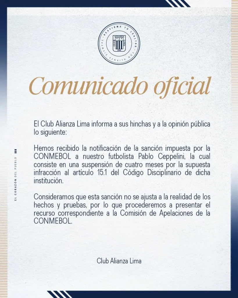 Minutos después del comunicado difundido por la Conmebol, la escuadra peruana apareció y advirtió que apelará la sanción impuesta al mediocampista ofensivo uruguayo debido a que consideran que “la sanción no se ajusta a la realidad de los hechos y pruebas”.
