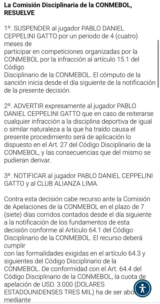 Es por eso que este viernes, la Comisión Disciplinaria de la Conmebol dio un veredicto final sobre el incidente de Ceppelini, por lo que se le castigó inhabilitándolo de toda competencia internacional por los próximos cuatro meses, por lo que solamente podría participar en el torneo local peruano.