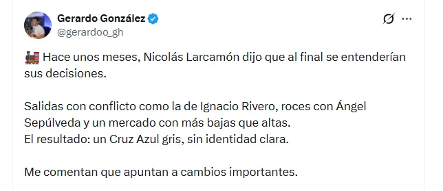 “Hace unos meses, Nicolás Larcamón dijo que al final se entenderían sus decisiones. Salidas con conflicto como la de Ignacio Rivero, roces con Ángel Sepúlveda y un mercado con más bajas que altas. El resultado: un Cruz Azul gris, sin identidad clara. Me comentan que apuntan a cambios importantes”, escribió.
