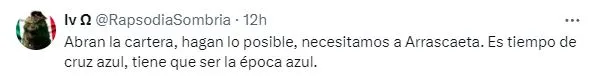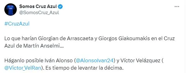 La realidad es que resulta muy complicado forzar la salida del uruguayo debido a que costaría mucho dinero. Sin embargo, la afición cementera está muy ilusionada con la nueva dupla que podrían ver en Cruz Azul. “Lo que harían Giorgian de Arrascaeta y Giorgos Giakoumakis en el Cruz Azul de Martín Anselmi… Háganlo posible Iván Alonso y Víctor Velázquez. Es tiempo de levantar la décima”, escribió Somos Cruz Azul, usuario de X.