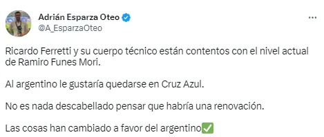 No obstante, con la llegada de Ricardo Ferretti la situación de Ramiro Funes Mori habría cambiado en La Noria, pues tanto el entrenador cementero está satisfecho con el desempeño del zaguero, como el argentino con el trabajo del Tuca, por lo que su futuro podría dar un giro inesperado y permanecer en la nómina celeste para el Apertura 2023.