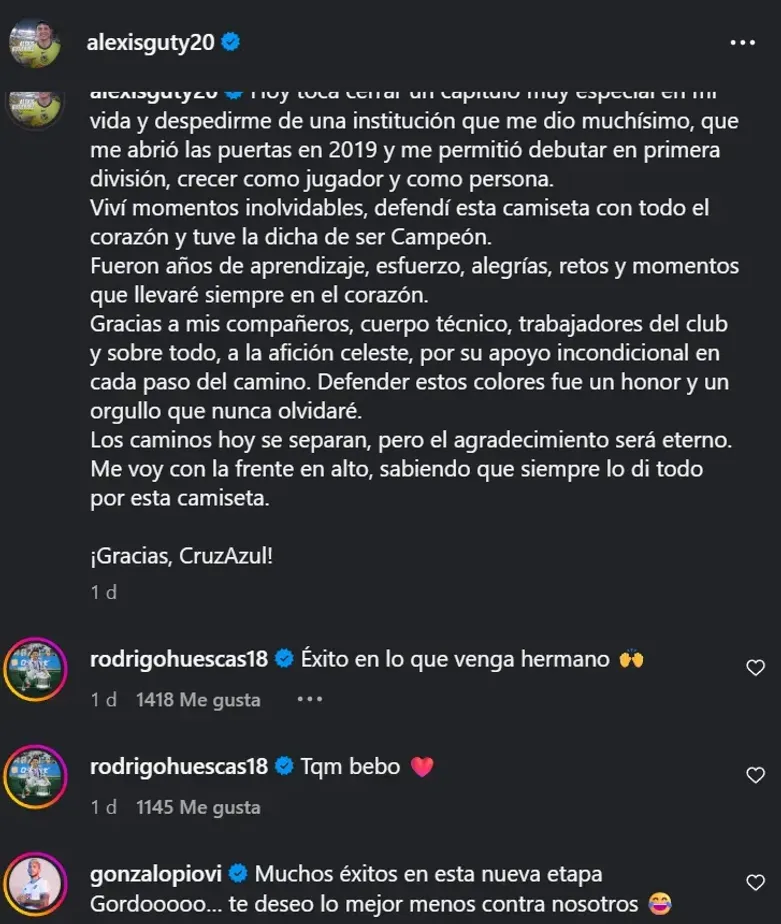 “Muchos éxitos en esta nueva etapa gordooooo…te deseo lo mejor menos antes nosotros“, exclamó el defensor central en las redes sociales jocosamente. Más arriba de dichas palabras se hizo presente Rodrigo Huescas, quien le deseó suerte en “todo lo que venga” en su carrera. De este modo se cierra un ciclo.