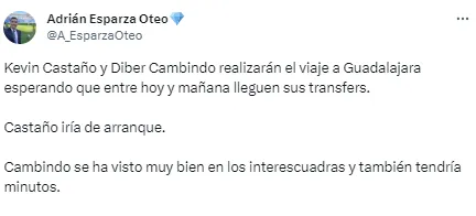 “Kevin Castaño y Diber Cambindo realizarán el viaje a Guadalajara esperando que entre hoy y mañana lleguen sus transfers. Castaño iría de arranque. Cambindo se ha visto muy bien en los interescuadras y también tendría minutos”, dio a conocer el periodista.