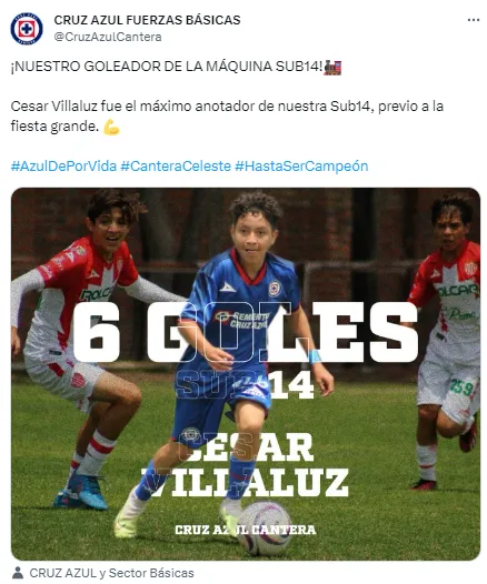 “¡NUESTRO GOLEADOR DE LA MÁQUINA SUB14! Cesar Villaluz fue el máximo anotador de nuestra Sub 14, previo a la fiesta grande”, presumió Cruz Azul a través de sus redes sociales, dedicadas a las Fuerzas Básicas, con lo cual hizo ilusionar a la afición, que sabe de la calidad y categoría que implica este apellido.