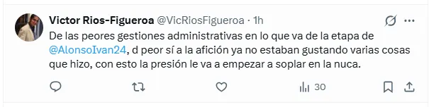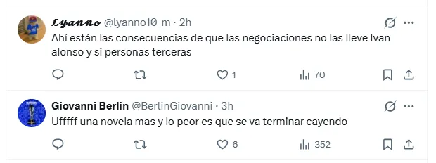 El enojo no se limitó solo al fichaje en sí. Varios aficionados cuestionaron la intervención de terceros en la negociación y la pérdida de control interno. “Ahí están las consecuencias de que las negociaciones no las lleve Iván Alonso”, se leyó en los comentarios más repetidos, mientras otros hablaron de los asesores y decisiones que no terminan de explicarse.