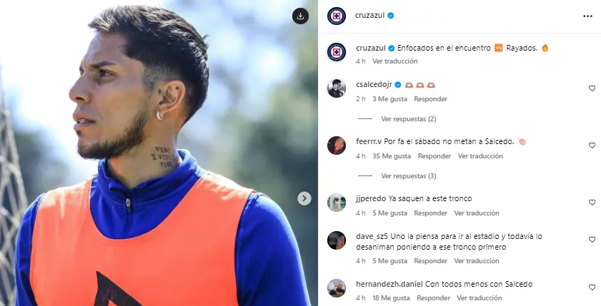 En las últimas horas, desde las redes sociales de Cruz Azul publicaron en Instagram un “carrusel” de fotos del entrenamiento pensando en el juego del sábado frente a Rayados de Monterrey. En dicho posteo múltiple, la imagen de Salcedo fue la primera.