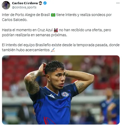 “Inter de Porto Alegre de Brasil tiene interés y realiza sondeos por Carlos Salcedo”, escribió el reportero en su cuenta de X. Sin embargo, aclaró que “hasta el momento en Cruz Azul no han recibido una oferta, pero podrían realizarla en semanas próximas”. Y añadió: “El interés del equipo Brasileño existe desde la temporada pasada, donde también hubo acercamientos”.