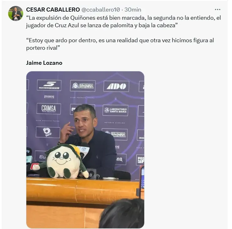 “La expulsión de Quiñones está bien marcada, la segunda no la entiendo, el jugador de Cruz Azul se lanza de palomita y baja la cabeza”, marcó en primera instancia. Para el técnico, lo sucedido con Aceves cambió por completo el rumbo del partido: “Si quieres despejar un balón y alguien se tira de paloma, terminas poniendo en riesgo la integridad de cualquier jugador”.