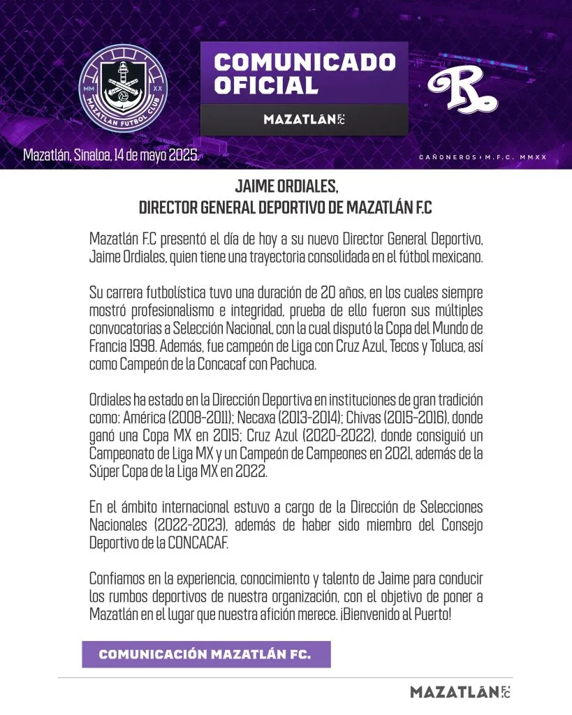 De manera inesperada, Mazatlán presentó oficialmente a Jaime Ordiales como su nuevo presidente deportivo. “Confiamos en la experiencia, conocimiento y talento para conducir los rumbos deportivos de nuestra organización, con el objetivo de poner a Mazatlán en el lugar que nuestra afición merece. ¡Bienvenido al puerto!”, es el mensaje que se puede leer en la presentación que se realizó en redes sociales.