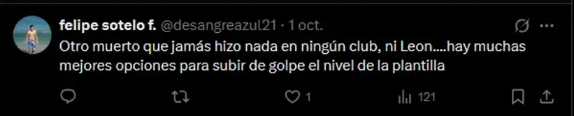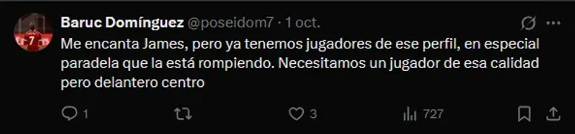 El perfil ‘Cruzazulismo’ fue el impulsor de la temática, en donde algunos comentarios en contra fueron: “Otro muerto que jamás hizo nada en ningún club, ni Leon….hay muchas mejores opciones” o “Me encanta James, pero ya tenemos jugadores de ese perfil, en especial Paradela que la está rompiendo”.