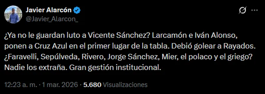 “¿Ya no le guardan luto a Vicente Sánchez? Larcamón e Iván Alonso, ponen a Cruz Azul en el primer lugar de la tabla. Debió golear a Rayados. ¿Faravelli, Sepúlveda, Rivero, Jorge Sánchez, Mier, el polaco y el griego (Bogusz y Giakoumakis)? Nadie los extraña. Gran gestión institucional”, disparó a través de su cuenta personal de X.