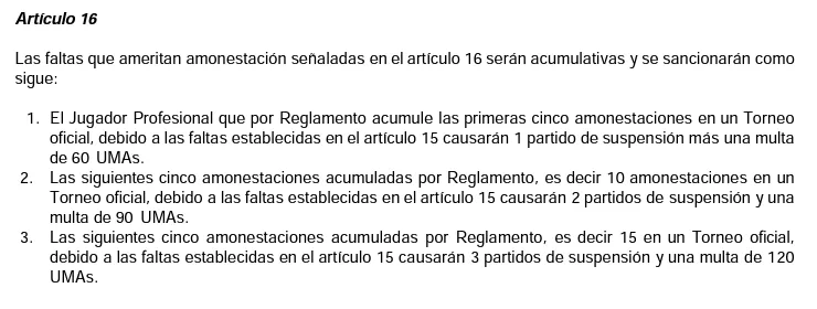 “El Jugador Profesional que por Reglamento acumule las primeras cinco amonestaciones en un Torneo oficial, debido a las faltas establecidas en el artículo 15 causarán 1 partido de suspensión más una multa de 60 UMAs”, es lo que dicta el reglamento de sanciones de la Liga MX en su artículo 16.