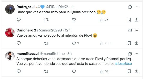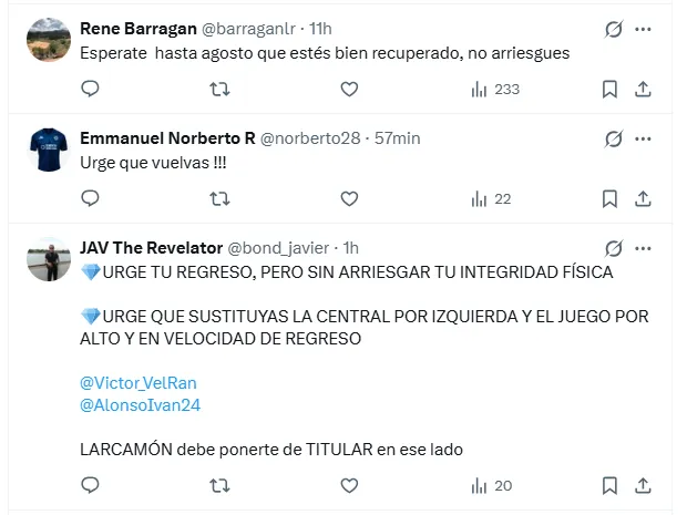 Otros mensajes reflejaron la urgencia deportiva del equipo en el presente torneo: “Urge que regreses, Piovi y Rotondi nos están matando en esa zona izquierda”, evidenciando el vacío que ha dejado el defensor en la estructura de La Máquina.