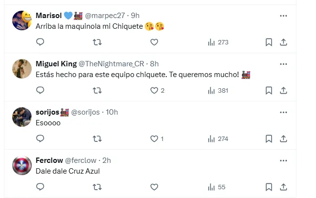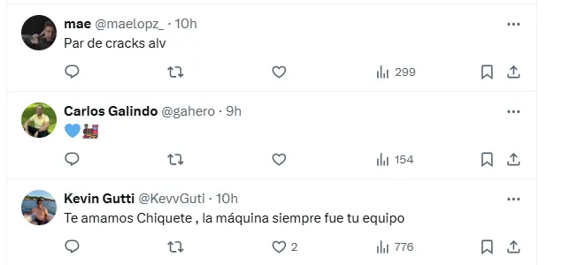 “Puro azul”, escribió el ex Chivas junto a un emoticón que refiere a La Máquina para ilustrar el momento junto al campeón de la Novena en 2021. Rápidamente, el posteo se llenó de reacciones de los seguidores de Cruz Azul: “Par de cracks“. “Estás hecho para este equipo chiquete. Te queremos mucho!”, “Dale dale Cruz Azul”, “Te amo, Chiquete”, “Arriba la maquinola mi Chiquete“, fueron otras reacciones.