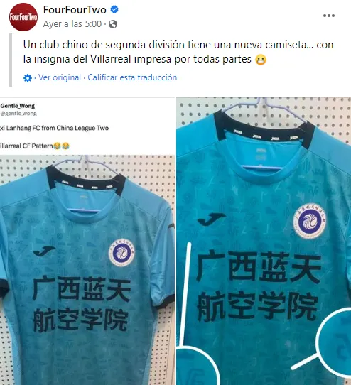 “Un club chino de segunda división tiene una nueva camiseta… con la insignia del Villarreal impresa por todas parte”, escribió dicho medio en su cuenta de Facebook.