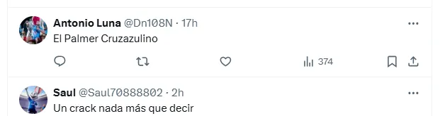 Después del triunfo ante los Bravos por la Jornada 9, algunos comentario destacaron entre la afición: “El Palmer cruzazulino”, en alusión al inglés Cole Palmer, figura del Chelsea y campeón del Mundial de Clubes hace apenas unos meses. Otros, incluso compartieron fotos resaltando el parecido futbolístico, mientras uno se animó a darle un giro a la comparación: “Cole Palmer, el Paradela inglés”.