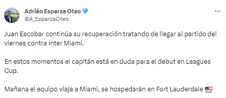 “Juan Escobar continúa su recuperación tratando de llegar al partido del viernes contra Inter Miami. En estos momentos el capitán está en duda para el debut en Leagues Cup“, apuntó.